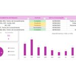 Logo ao abrir a Planilha Controle de Prontuários, você encontra um dashboard intuitivo, com indicadores visuais que facilitam a leitura dos dados. É possível visualizar, de maneira objetiva, o total de pacientes cadastrados, a quantidade de atendimentos realizados, exames feitos e documentos registrados. Além disso, há gráficos que mostram a evolução dos atendimentos mês a mês, e um painel com o status dos documentos (completos, pendentes ou incompletos).