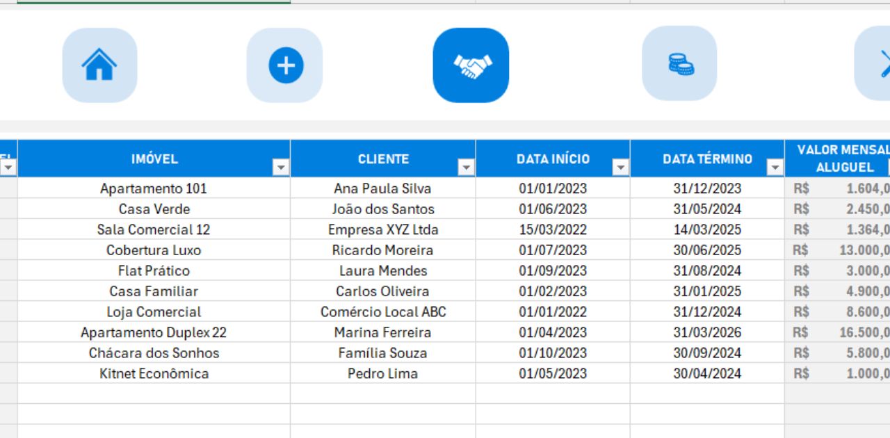 A planilha também permite a administração detalhada dos contratos de locação. Na seção de Contratos, você pode preencher as colunas com: