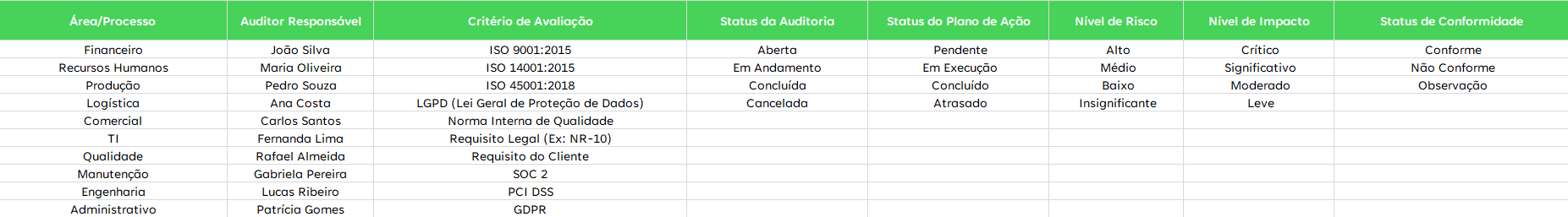 Em conclusão, essa planilha traz mais segurança, precisão e profissionalismo para sua rotina. Ela torna o processo de auditoria mais claro, facilita o acompanhamento das evidências e garante uma visão completa das atividades. Com essa ferramenta, você ganha organização, transparência e confiança para conduzir auditorias internas de um jeito moderno e eficaz.