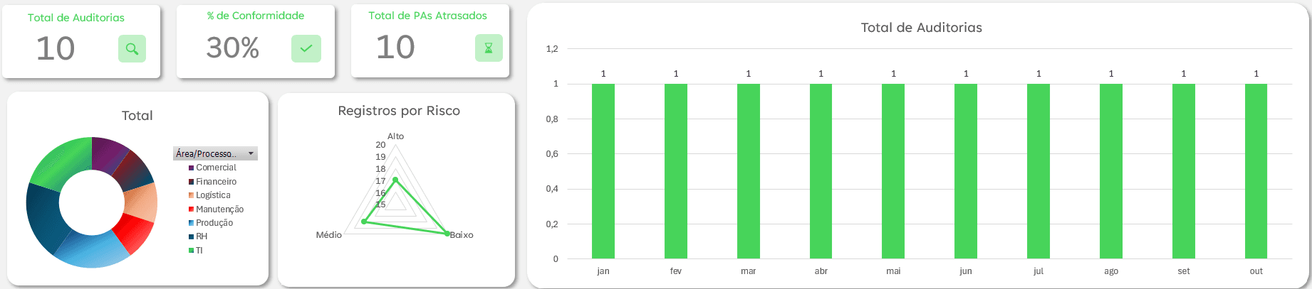 Ao acessar a planilha, você encontra um Dashboard intuitivo. Nele, aparecem cards visuais que mostram o Total de Auditorias, o percentual de Conformidade e o Total de Planos de Ação atrasados. Além disso, você conta com gráficos dinâmicos que apresentam dados por área, classificam registros por risco e exibem o volume total de auditorias realizadas. Dessa forma, você entende rapidamente o cenário geral e identifica onde precisa atuar.