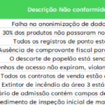 Em seguida, a aba “Registros” proporciona documentar cada etapa do processo. Lá, você preenche o ID da Auditoria, a data, o setor avaliado, o critério utilizado, o status de conformidade, a descrição da não conformidade, o nível de risco, o impacto, o auditor responsável e qualquer observação relevante. Tudo fica organizado e fácil de consultar depois.