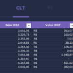 Na aba CLT, o foco está na contratação com registro em carteira. Dessa forma, aqui, são preenchidos campos essenciais como Salário Bruto, Base e Valor de INSS, Base e Valor de IRRF, Outros Descontos, Salário Líquido CLT, Custo do Empregador e Custo Total CLT mensal. Com isso, a planilha calcula automaticamente os impactos financeiros dessa modalidade, trazendo mais precisão ao controle.