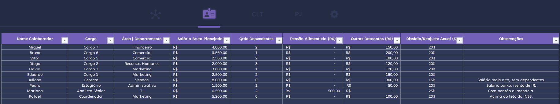 Em seguida, para registrar as informações dos colaboradores, basta acessar a aba Cadastro. Nessa área, são inseridos dados como Nome do Colaborador, Cargo, Área ou Departamento, Salário Bruto Planejado, Quantidade de Dependentes, Pensão Alimentícia, Outros Descontos, Dissídio ou Reajuste Anual e Observações. Assim, todas as informações ficam centralizadas e organizadas, o que evita erros e retrabalho.