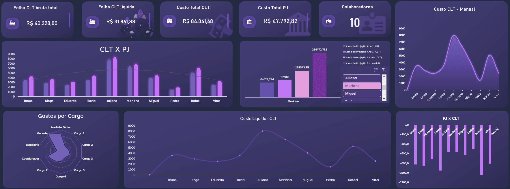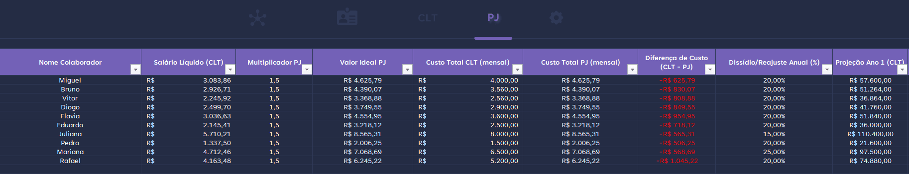 Já na aba PJ, a análise se torna ainda mais estratégica. Nesse sentido, são considerados dados como Multiplicador PJ, Valor Ideal PJ, Custo Total CLT mensal, Custo Total PJ mensal e Diferença de Custo entre CLT e PJ. Ou seja, a planilha apresenta projeções de curto e médio prazo, como Projeção de 1 Ano e Projeção de 3 Anos, permitindo uma visão clara do impacto financeiro ao longo do tempo.
