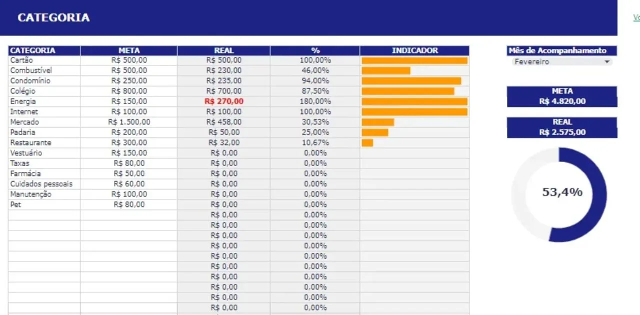 A facilidade de cadastro e a flexibilidade da planilha permitem que você adicione ou substitua categorias conforme necessário. Para exemplificar, você pode criar uma nova categoria, como “Pet”, com uma meta mensal de R$ 80.Acompanhe o desempenho de suas categorias ao longo dos meses, visualizando gráficos intuitivos que destacam o progresso em relação às metas. Nesse sentido, o gráfico de rosca proporciona uma visão rápida e colorida dos gastos relacionados a categorias como “Energia”, permitindo ajustes conforme necessário.