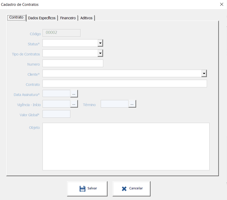 • Cadastre data de assinatura, vigência e valores.
