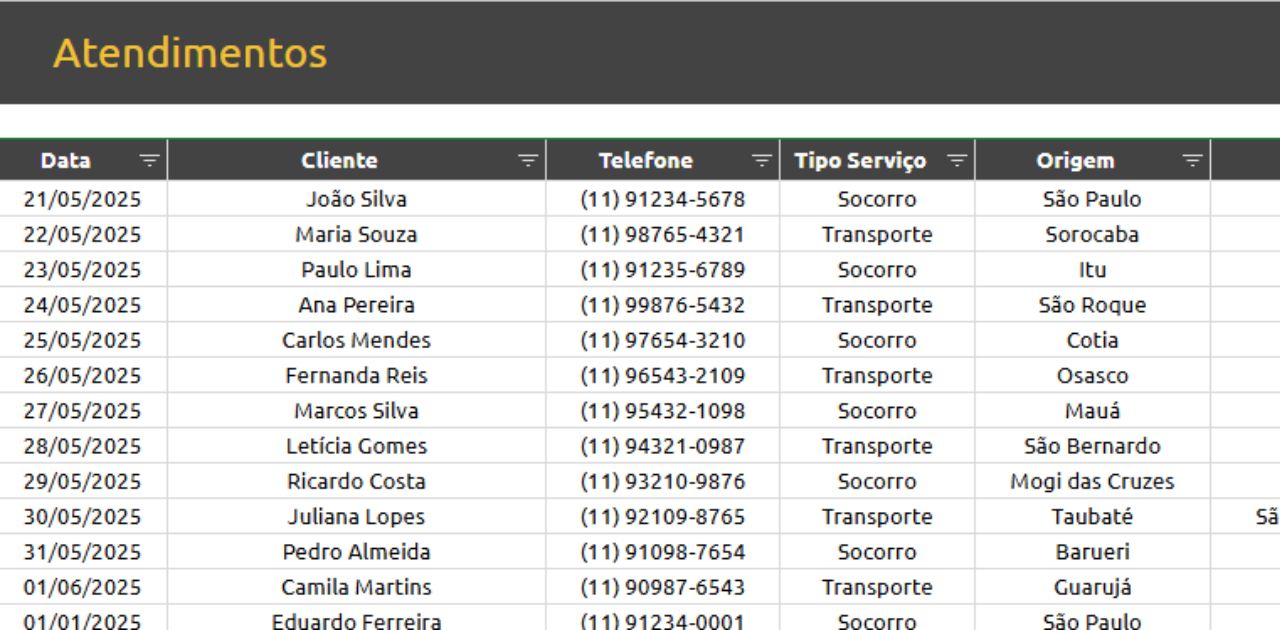 Especificação mensal/diária dos serviços prestados a clientes. Dessa forma, acrescente também a data, o tipo de atendimento, valor do serviço e o cliente atendido.
