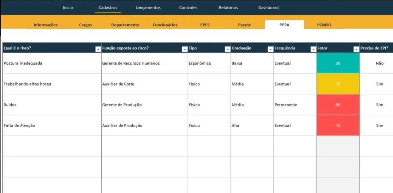 Planilha PPRA e PCMSO: facilite o controle de saúde ocupacional, prevenindo acidentes e atendendo à legislação com cadastros, relatórios e dashboards completos.