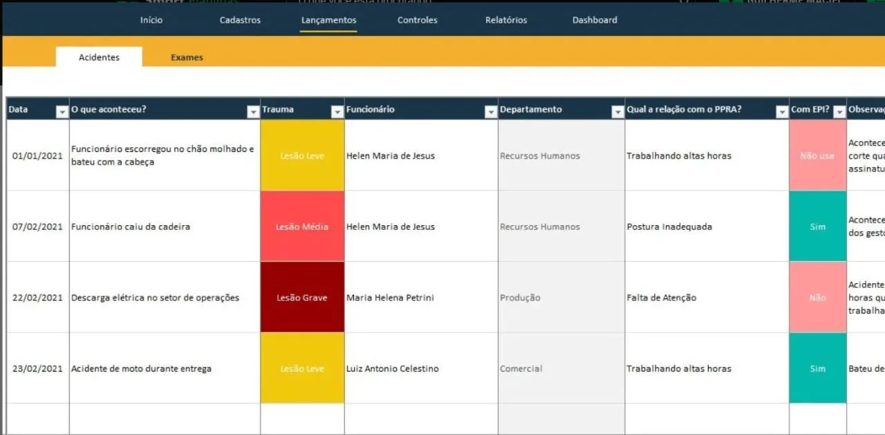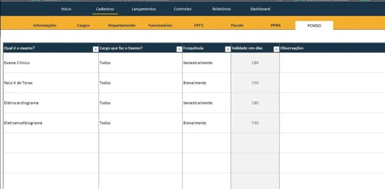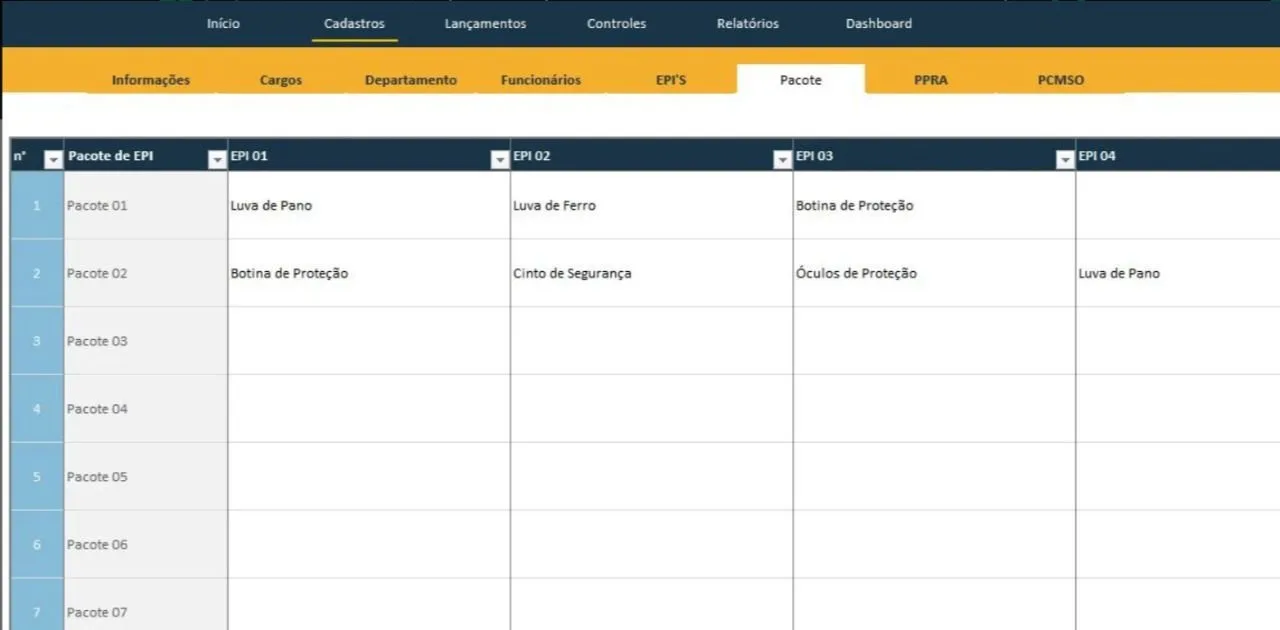 Cadastros: A planilha dispõe de recursos que permitem o cadastro de cargos, departamentos, funcionários e EPIs.