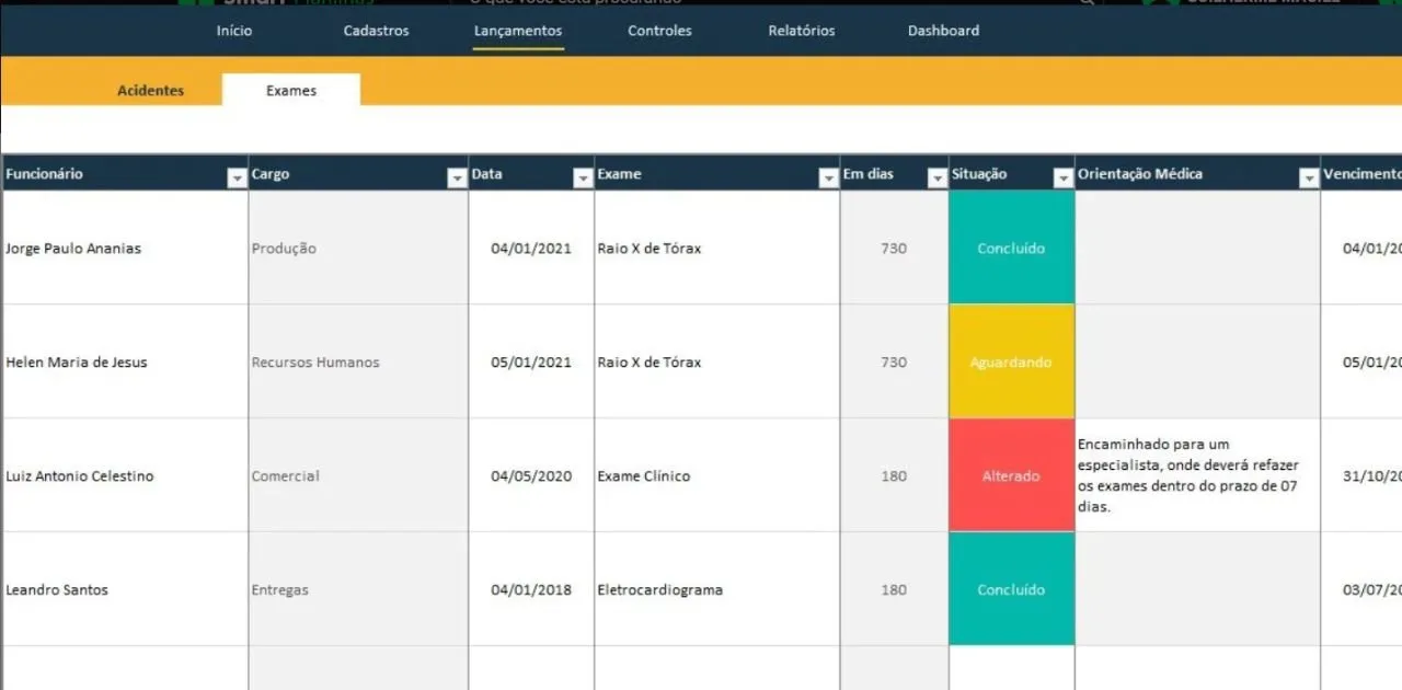 Controles: permite o controle de exames e orientações médicas relacionadas ao acidente de trabalho e o controle de acidentes por grau da lesão e exames por tipo.